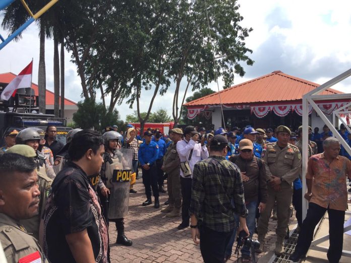 Massa tetap saling berteriak. Namun berhasil ditenangkan oleh korlap yang berada di mobil komando. “Bapak-Ibu sekalian, kita sudah dipanggil berapa kali ke Jakarta. Bapak suruh saya bicara atau suruh saya diam?,” kata Rudi dengan nada tinggi.