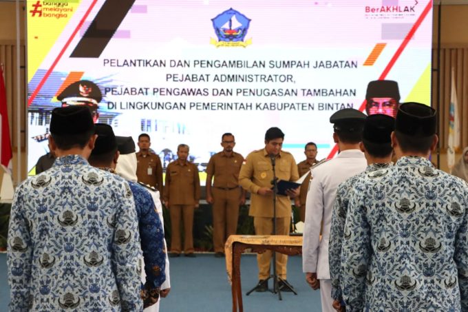 BATAMUPDATE.COM, BINTAN-Sebanyak 37 orang Pejabat Administrator dan Pengawas dilantik oleh Bupati Bintan, Roby Kurniawan, Senin (04/09) di Aula Bandar Seri Bentan. Pejabat yang dilantik dan diambil Sumpah Jabatan tersebut terdiri dari 11 Pejabat Eselon III dan 26 Pejabat Eselon IV.