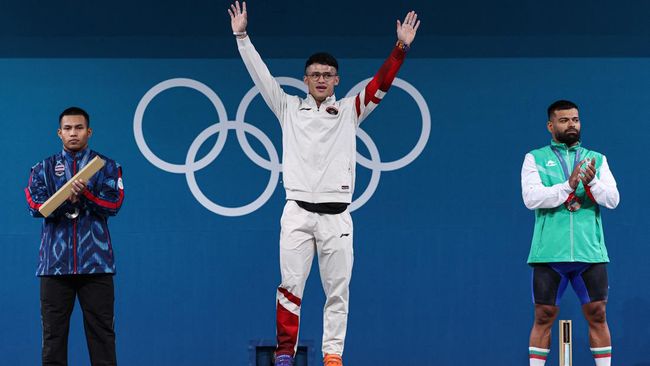Rizki Juniansyah berhasil menyabet medali emas pada pertandingan angkat besi kelas 73 kg putra Olimpiade Paris 2024 yang tersaji di South Paris Arena 6, Prancis, Kamis waktu setempat.