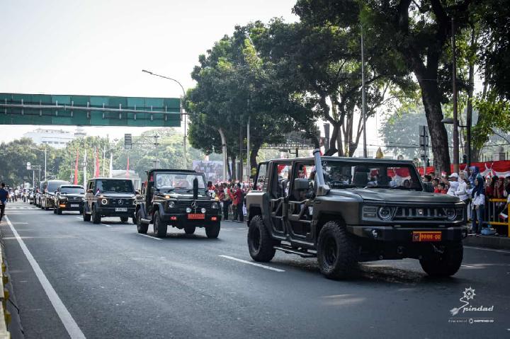 TEMPO.CO, Bandung – Prosesi kirab duplikat bendera pusaka Merah Putih dan Teks Proklamasi dari Monas menuju Bandara Halim Perdanakusuma hari ini, Sabtu, 10 Agustus 2024, menggunakan kendaraan MV3 Maung Tangguh buatan PT Pindad. Satu unit kendaraan tambahan MV3-Maung Komando disiagakan di bagian belakang rangkaian kendaraan mengantisipasi terjadi hujan di perjalanan. Kirab tersebut bagian dari pengantaran bendera pusaka Merah Putih dan Teks Proklamasi yang akan diterbangkan menuju Ibu Kota Nusantara (IKN).