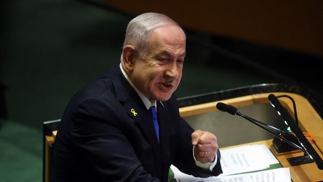 Perdana Menteri Israel Benjamin Netanyahu memamerkan kemenanganya usai militer berhasil membunuh pemimpin Hizbullah, Hassan Nasrallah, dalam pidatonya di Majelis Umum Perserikatan Bangsa-Bangsa (PBB) pada Jumat (27/9) malam waktu New York.