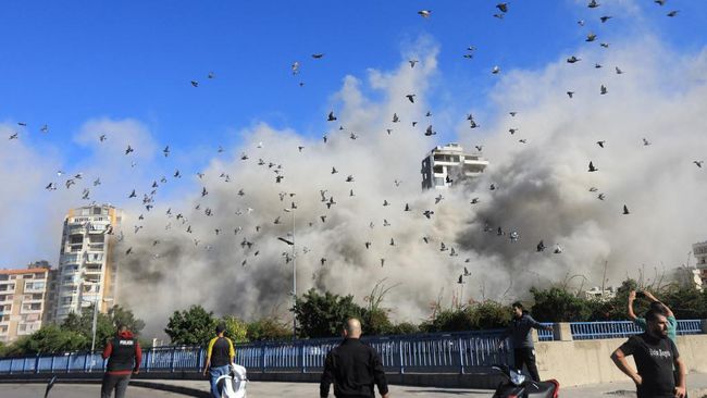 Sejumlah foto dan video viral di media sosial menangkap detik-detik sebuah rudal Israel menyerang gedung apartemen di pinggiran selatan ibu kota Beirut, Lebanon, hingga roboh seketika pada Selasa (22/10).