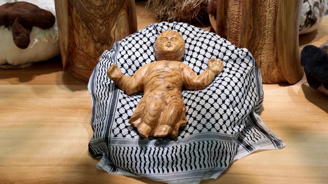 Pameran Natal seminal Betlehem di Vatikan menampilkan patung bayi Yesus Kristus yang mengenakan kafiyeh sebagai simbol dukungan atas Palestina dari agresi Israel.