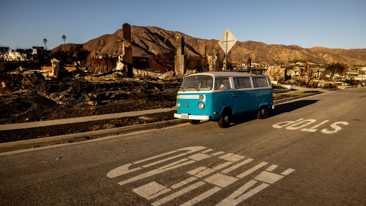 Sebuah mobil van retro biru cerah secara ajaib selamat dari kebakaran Los Angeles di Malibu, Amerika Serikat.