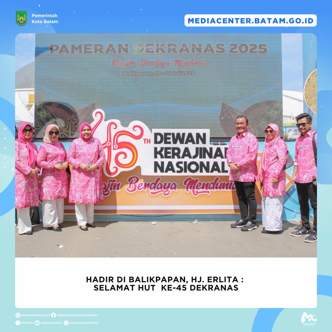𝐃𝐢𝐬𝐤𝐨𝐦𝐢𝐧𝐟𝐨 𝐁𝐚𝐭𝐚𝐦 – Ketua Dewan Kerajinan Nasional Daerah (Dekranasda) Kota Batam, Hj. Erlita Amsakar hadir langsung pada puncak acara Hari Ulang Tahun (HUT) ke-45 Dewan Kerajinan Nasional (Dekranas) di Kota Balikpapan, Kalimantan Timur, Rabu 10 Juli 2025.